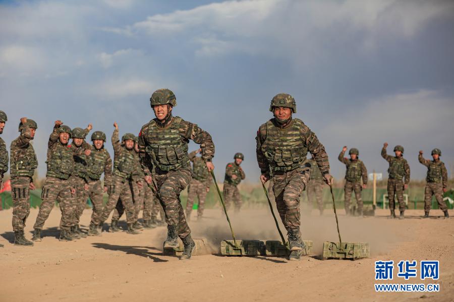 武警新疆總隊某機動支隊特戰(zhàn)一中隊組織官兵進行搬運子彈箱體能訓(xùn)練(10月30日攝)。新華社發(fā)(張文 攝)