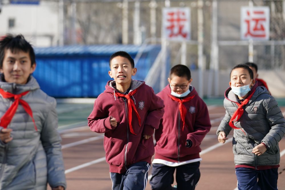 ??12月21日,在北京四中廣外校區(qū),蔡昊霖(左二)和同學(xué)一起上體育課。