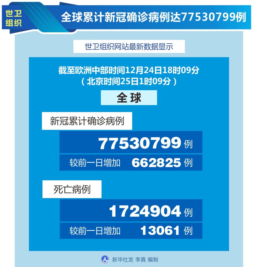 世衛(wèi)組織網(wǎng)站最新數(shù)據(jù)顯示,截至歐洲中部時間24日18時09分(北京時間25日1時09分),全球確診病例較前一日增加662825例,達到77530799例;死亡病例增加13061例,達到1724904例。