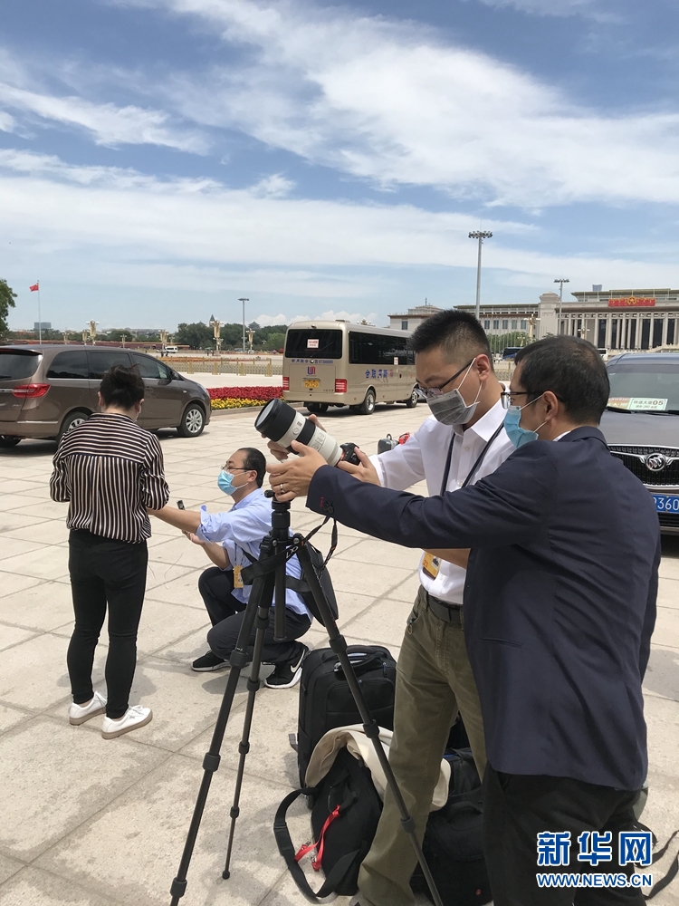 5月20日,全國政協(xié)十三屆三次會議召開新聞發(fā)布會。大會新聞發(fā)言人郭衛(wèi)民向中外媒體介紹本次大會有關情況并回答記者提問。圖為本網記者在人民大會堂東門外廣場做直播前準備工作。新華網記者 周紅軍? 攝