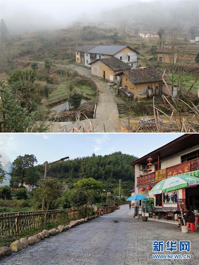 拼版照片:上圖為脫貧前的江西井岡山神山村一角(2016年1月攝);下圖為2019年9月拍攝的江西井岡山神山村一角。新華社發(fā)