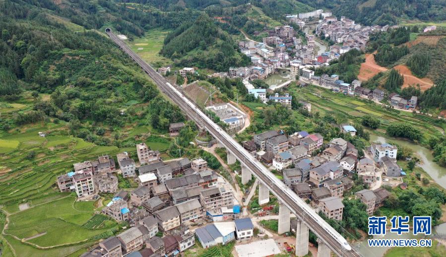 2020年10月4日,一列動(dòng)車行經(jīng)貴廣高鐵三江侗族自治縣同樂苗族鄉(xiāng)同樂村路段(無人機(jī)照片)。