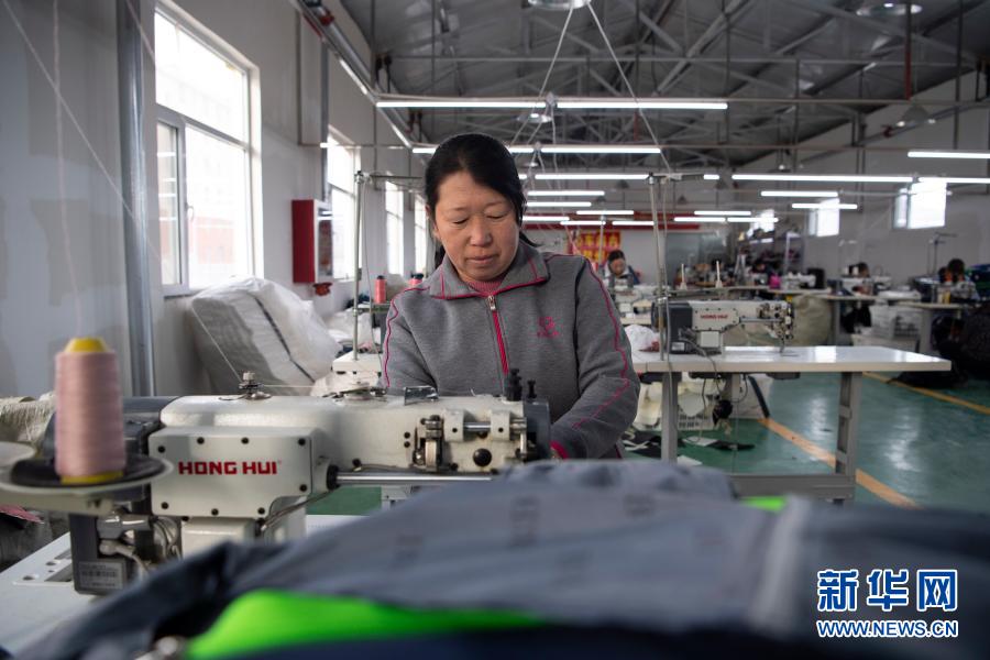 2020年12月29日,李三花在嵐縣普明鎮(zhèn)移民小區(qū)扶貧車間里加工箱包。新華社記者 楊晨光 攝