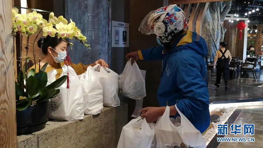2月17日,外賣配送員在成都一家火鍋店交接消費(fèi)者在線上下單的外賣火鍋(手機(jī)照片)。新華社記者 胡旭 攝