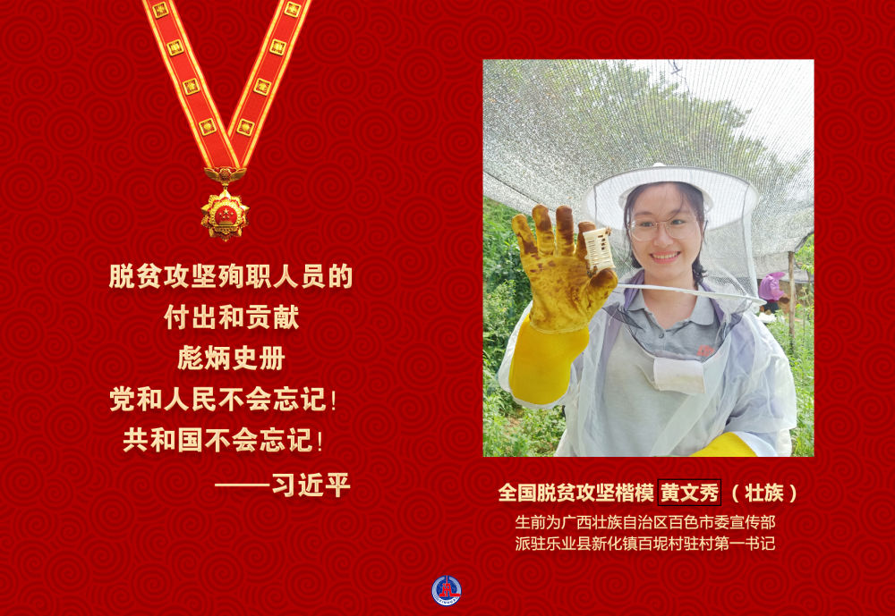 黃文秀同志把青春和熱血都獻給了脫貧攻堅事業(yè),以實際行動詮釋了共產(chǎn)黨人的初心和使命,用短暫而精彩的人生譜寫了一曲新時代共產(chǎn)黨員的奉獻之歌。2019年6月17日犧牲在脫貧攻堅一線,年僅30歲。