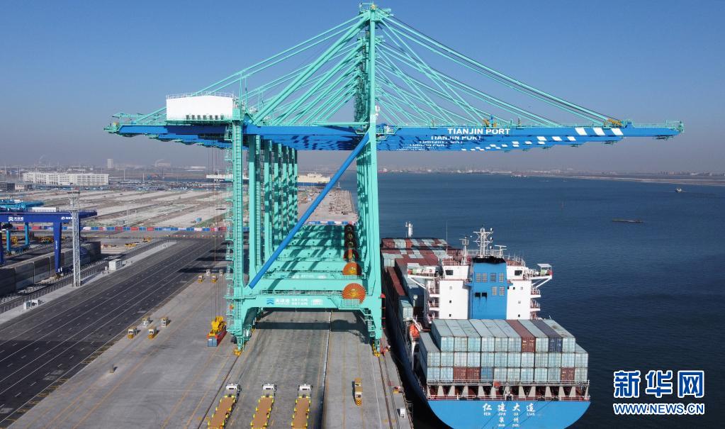 這是2021年1月17日拍攝的天津港北疆港區(qū)C段智能化集裝箱碼頭一號(hào)泊位(無人機(jī)照片)。新華社記者趙子碩 攝
