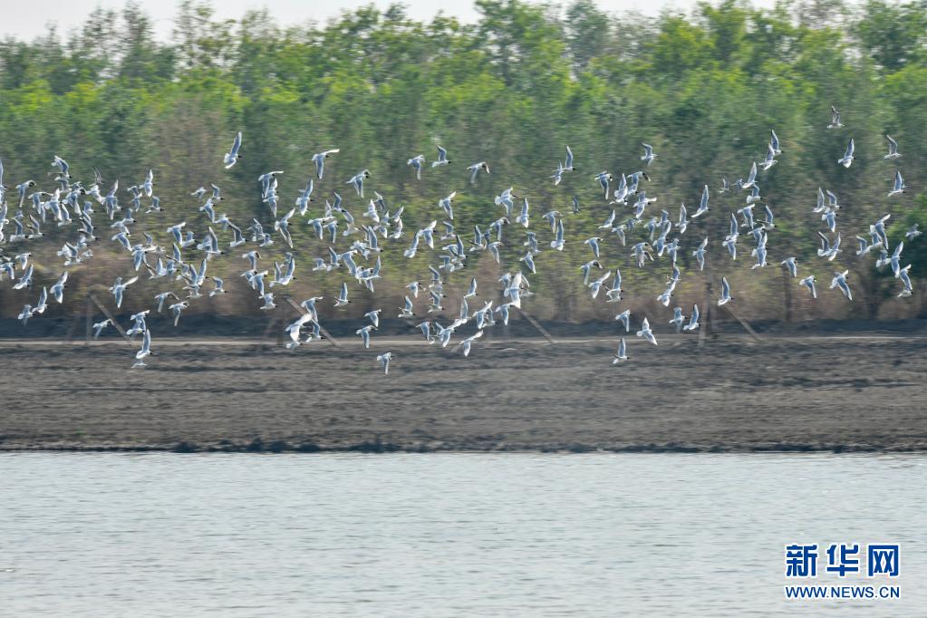 水鳥在天津市西青區(qū)西西海生態(tài)濕地上空飛翔(4月27日攝)。新華社發(fā)(孫凡越 攝)