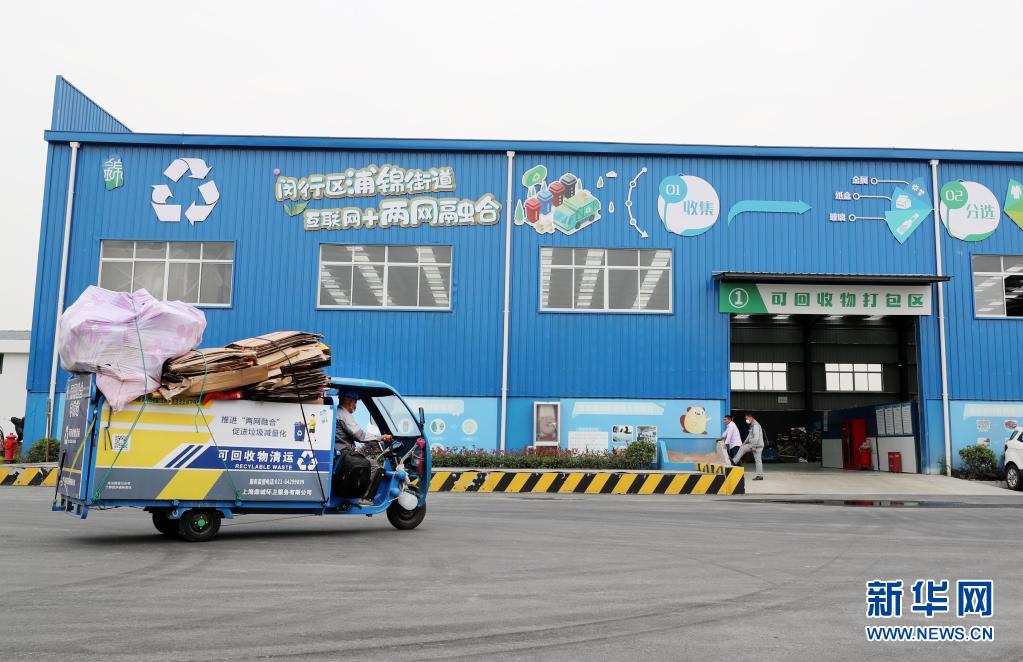 一輛可回收物清運車駛?cè)肷虾ih行區(qū)浦錦街道的“兩網(wǎng)融合”中轉(zhuǎn)服務(wù)站(2020年5月27日攝)。新華社記者 方喆 攝