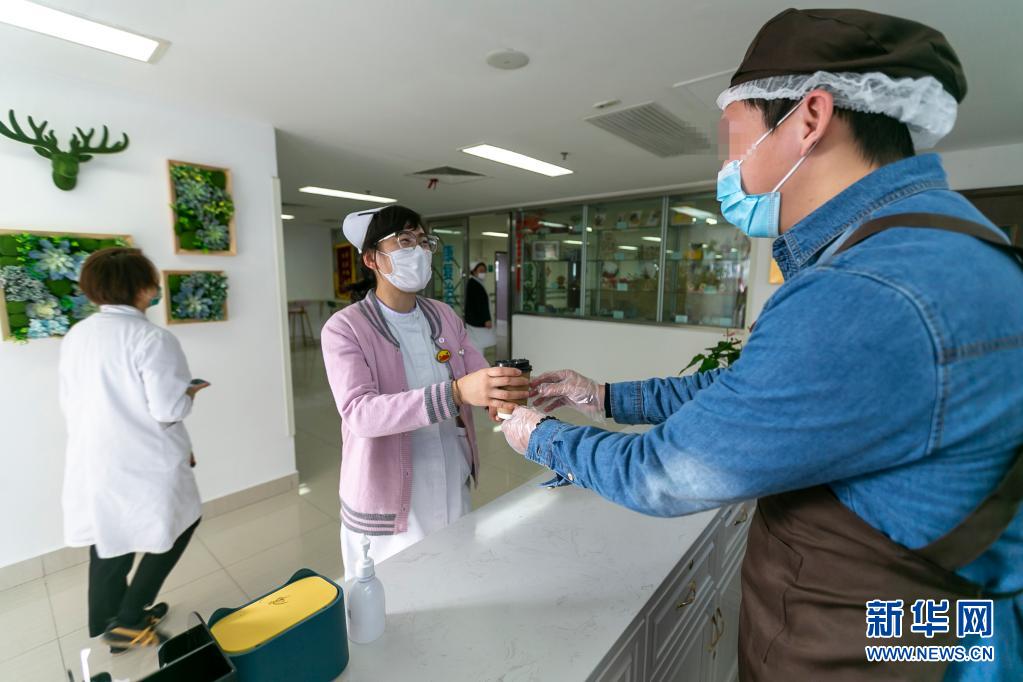 在上海市楊浦區(qū)精神衛(wèi)生中心開了一家名叫“Healing Coffee”的咖啡店,三名已出院的患者輪流擔(dān)任調(diào)制咖啡、收銀、結(jié)算的工作??Х鹊隇樾l(wèi)生中心的工作人員提供咖啡等飲品。這是見習(xí)咖啡師沐枝為醫(yī)護人員送上制作好的咖啡(2020年12月3日攝)。新華社記者 王翔 攝