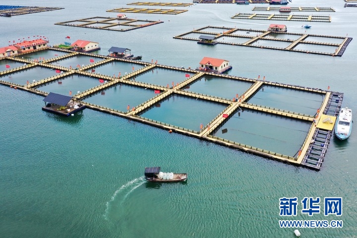 漁船駛過(guò)福建省寧德市三都澳大黃魚(yú)深水塑膠漁排養(yǎng)殖區(qū)(無(wú)人機(jī)照片,2020年7月15日攝)。新華社記者姜克紅攝