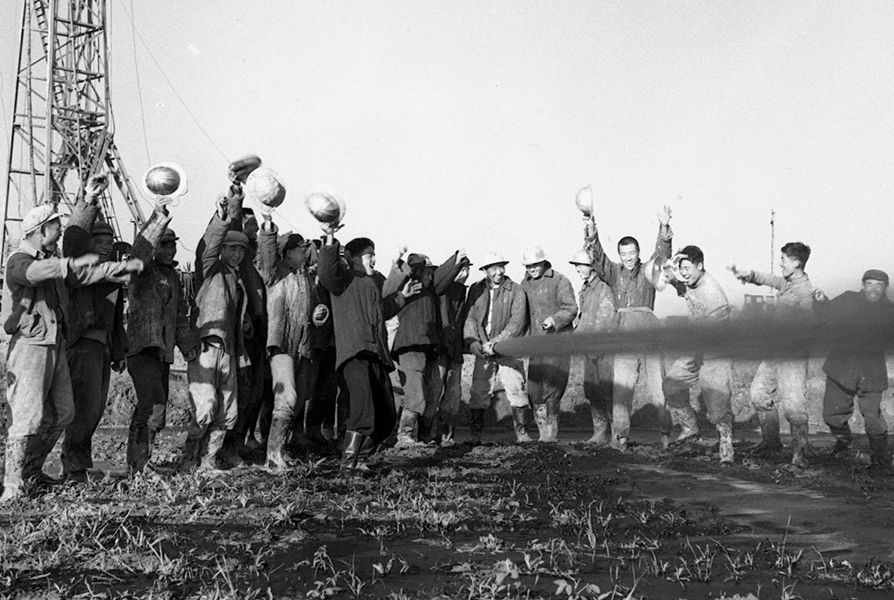 1963年,大慶油田建成。這是大慶油田工人在對一口油井進行試噴。新華社圖片