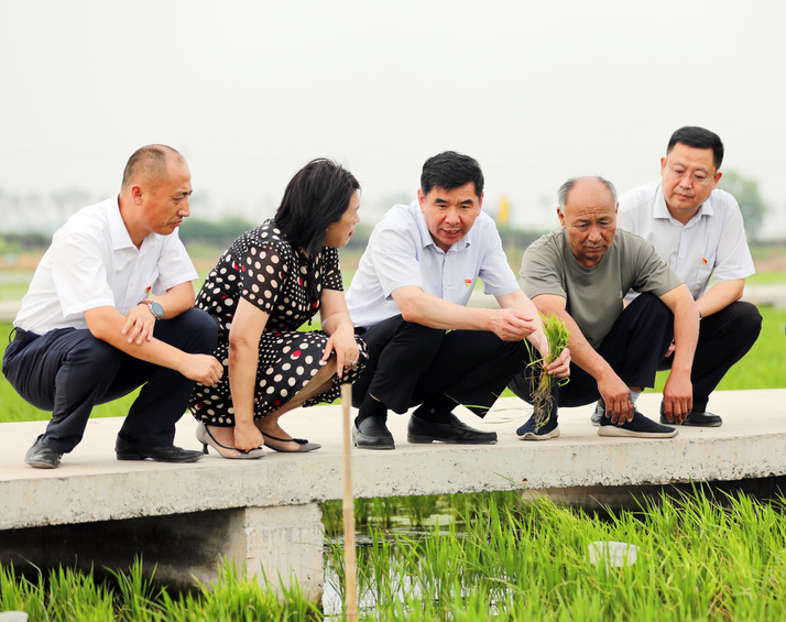 日前,劉斯杰(左三)在東營市墾利區(qū)耐鹽堿水稻實驗基地察看水稻長勢。(墾利區(qū)委宣傳部提供)