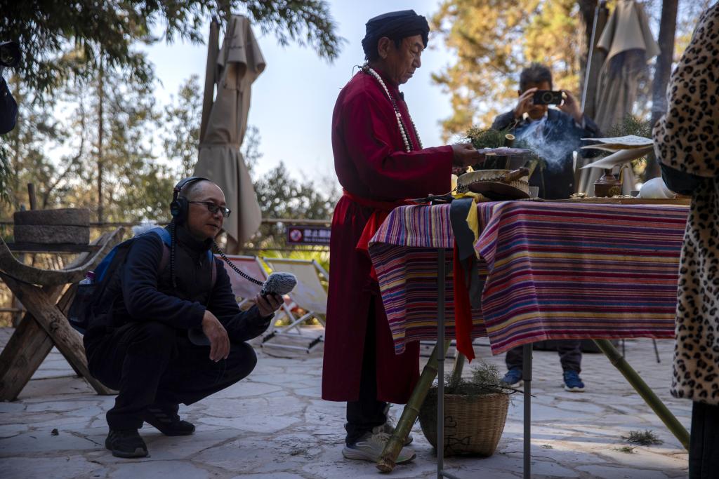 1月16日,和德华(左)在丽江黑龙潭公园录制特色乐器的声音。
