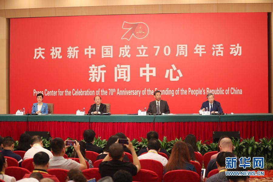 9月24日,慶祝中華人民共和國成立70周年活動新聞中心在北京梅地亞中心二層新聞發(fā)布廳舉辦第一場新聞發(fā)布會。圖為新聞發(fā)布會現(xiàn)場。新華網(wǎng)記者 陳競超 攝