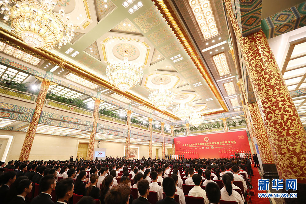 ??? 9月29日上午10時,中華人民共和國國家勛章和國家榮譽(yù)稱號頒授儀式在人民大會堂隆重舉行。圖為頒授儀式現(xiàn)場。新華網(wǎng) 陳杰 攝