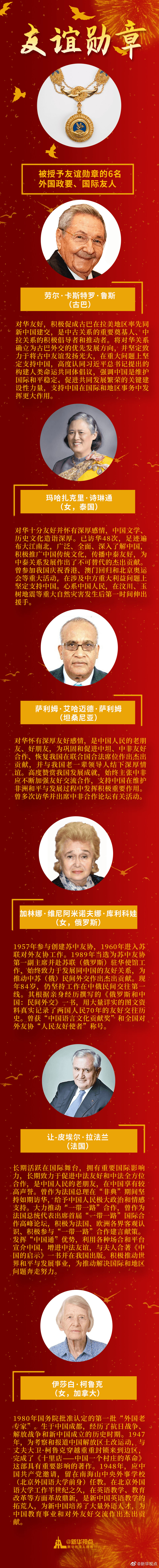 勞爾·卡斯特羅·魯斯、瑪哈扎克里·詩琳通等6人被授予“友誼勛章”。他們與中國結(jié)下不解情緣,留下一段段佳話。為他們點(diǎn)贊? ????