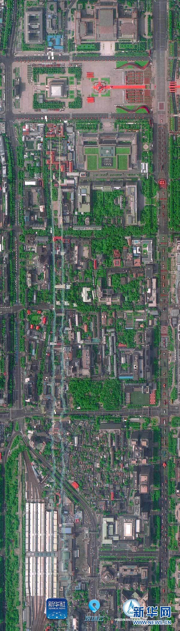 這是“高景1號”拍攝的拉出彩煙的空中梯隊即將通過天安門廣場上空(10月1日攝)。 10月1日上午,慶祝中華人民共和國成立70周年大會在北京天安門廣場隆重舉行。新華社聯(lián)合多家單位調(diào)用多顆國產(chǎn)衛(wèi)星俯瞰閱兵,從“最高機位”發(fā)回這三張珍貴的長安街全畫幅衛(wèi)星圖。 新華社發(fā)(中國四維測繪技術(shù)有限公司提供)