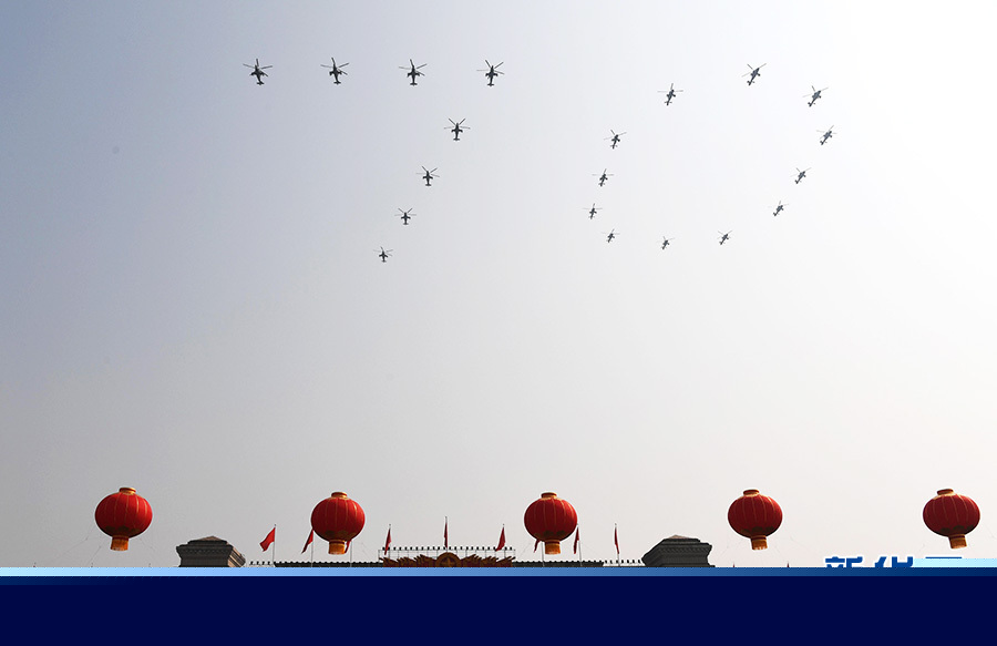 10時(shí)43分,3架載旗直升機(jī)依次飛過天安門廣場(chǎng)上空,黨旗、國旗、軍旗迎風(fēng)飄揚(yáng),緊隨其后的20架直升機(jī)組成巨大“70”字樣……