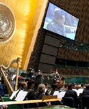 國東部時間5月20日下午,紐約曼哈頓,聯(lián)合國總部大會廳。一場中美軍樂團聯(lián)合音樂會隆重舉行。首次走進聯(lián)合國的中國人民解放軍軍樂團,演奏了《歌唱祖國》為音樂會“壓軸”。激昂的樂曲在這里回蕩,難忘的歷史在這里流淌……