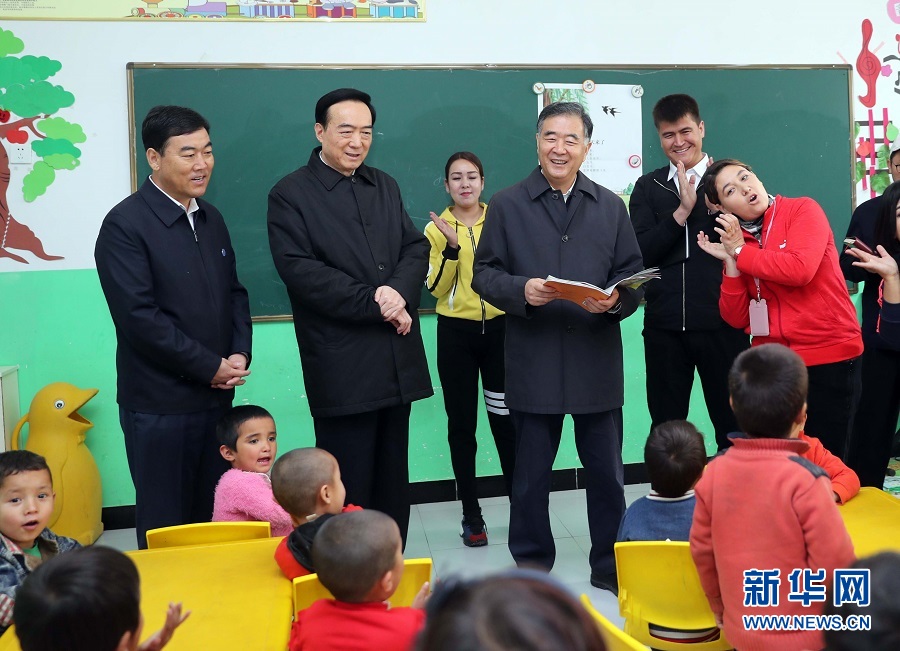 4月10日至14日,中共中央政治局常委、全國政協主席汪洋在新疆調研。這是4月11日,汪洋來到和田縣村里的幼兒園看望孩子?!⌒氯A社記者劉衛(wèi)兵 攝