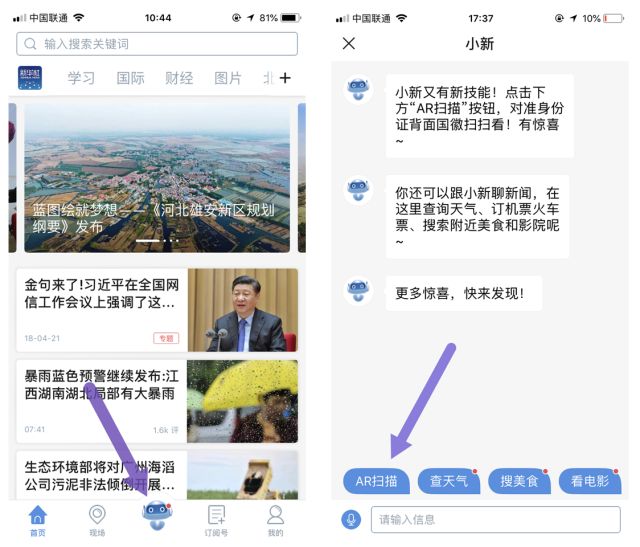 只要點擊新華社客戶端首頁下方的“小新機器人”,使用“AR功能”掃描二代身份證帶有國徽和長城圖案的一面,就可以隨時和新華社記者一起出發(fā)。