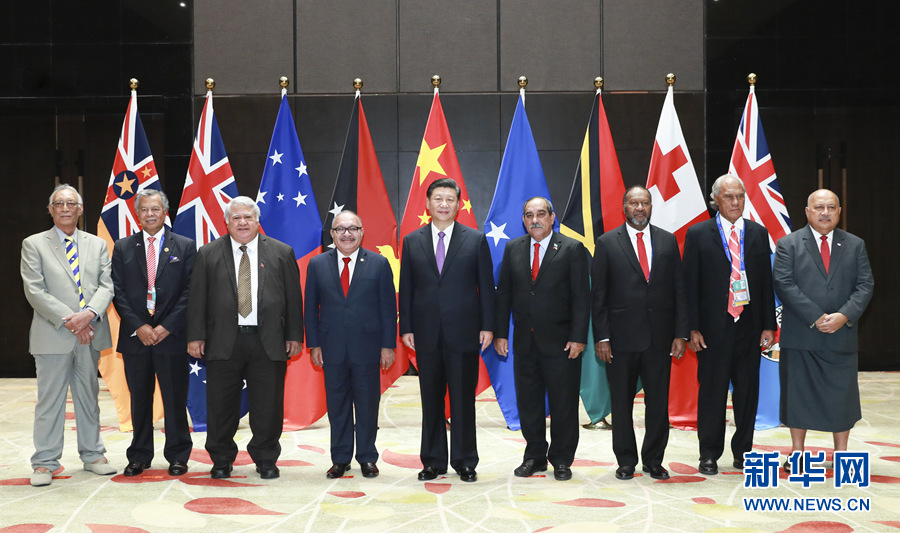 11月16日,國(guó)家主席習(xí)近平在莫爾茲比港同巴布亞新幾內(nèi)亞總理奧尼爾、密克羅尼西亞聯(lián)邦總統(tǒng)克里斯琴、薩摩亞總理圖伊拉埃帕、瓦努阿圖總理薩爾瓦伊、庫(kù)克群島總理普納、湯加首相波希瓦、紐??偫硭冉ń惶窖髰u國(guó)領(lǐng)導(dǎo)人以及斐濟(jì)政府代表、國(guó)防部長(zhǎng)昆布安博拉舉行集體會(huì)晤。習(xí)近平主持會(huì)晤并發(fā)表主旨講話。 新華社記者 龐興雷 攝