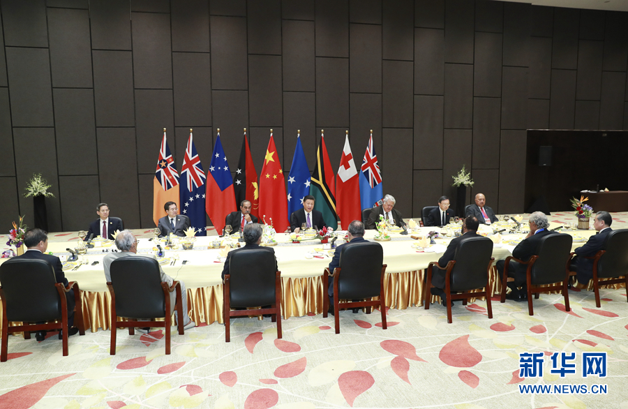 11月16日,國家主席習(xí)近平在莫爾茲比港同巴布亞新幾內(nèi)亞總理奧尼爾、密克羅尼西亞聯(lián)邦總統(tǒng)克里斯琴、薩摩亞總理圖伊拉埃帕、瓦努阿圖總理薩爾瓦伊、庫克群島總理普納、湯加首相波希瓦、紐??偫硭冉ń惶窖髰u國領(lǐng)導(dǎo)人以及斐濟政府代表、國防部長昆布安博拉舉行集體會晤。習(xí)近平主持會晤并發(fā)表主旨講話。 新華社記者 龐興雷 攝