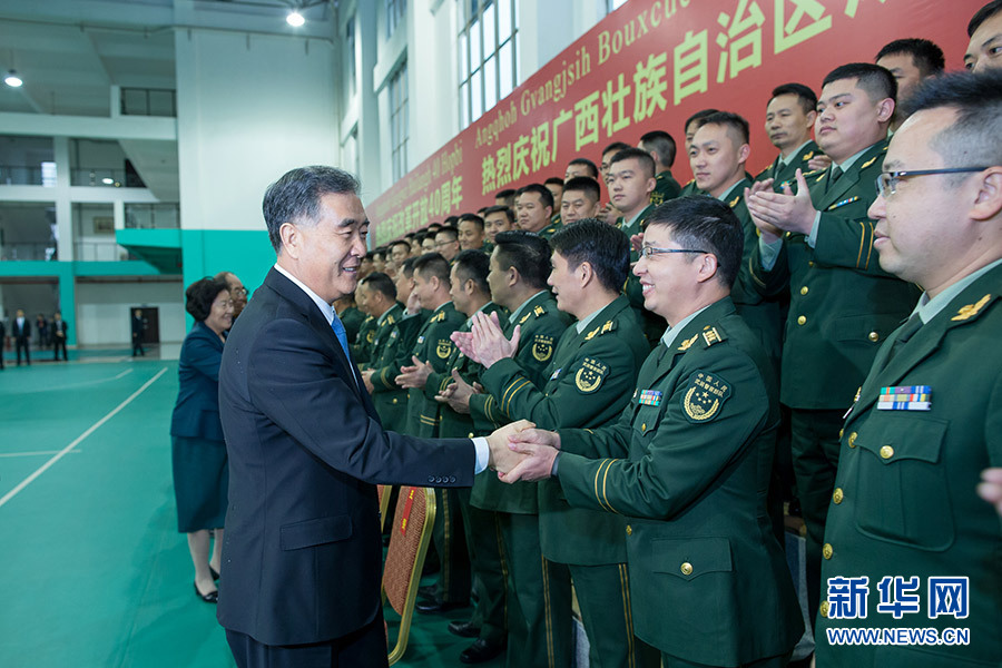 在慰問廣西軍區(qū)和駐桂部隊(duì)官兵代表時,汪洋指出,廣西是英雄的省份,是紅色的熱土。老一輩革命家在這里書寫了中國革命史上光輝一頁。廣西軍區(qū)建立以來,一茬接一茬官兵在這里保家衛(wèi)國、無私奉獻(xiàn),為實(shí)現(xiàn)祖國邊疆安寧、人民幸福安康作出了重大貢獻(xiàn)。你們付出的艱辛努力,取得的光輝業(yè)績,黨和政府不會忘記,人民不會忘記。
