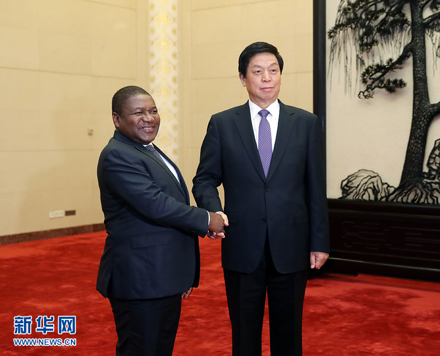 4月24日,全國(guó)人大常委會(huì)委員長(zhǎng)栗戰(zhàn)書在北京人民大會(huì)堂會(huì)見(jiàn)莫桑比克總統(tǒng)紐西。 新華社記者劉衛(wèi)兵攝