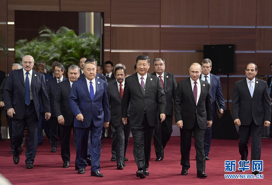 4月26日,國家主席習(xí)近平在北京出席第二屆“一帶一路”國際合作高峰論壇開幕式,并發(fā)表題為《齊心開創(chuàng)共建“一帶一路”美好未來》的主旨演講。這是習(xí)近平和出席開幕式的外方領(lǐng)導(dǎo)人共同步入會(huì)場。 新華社記者李學(xué)仁攝