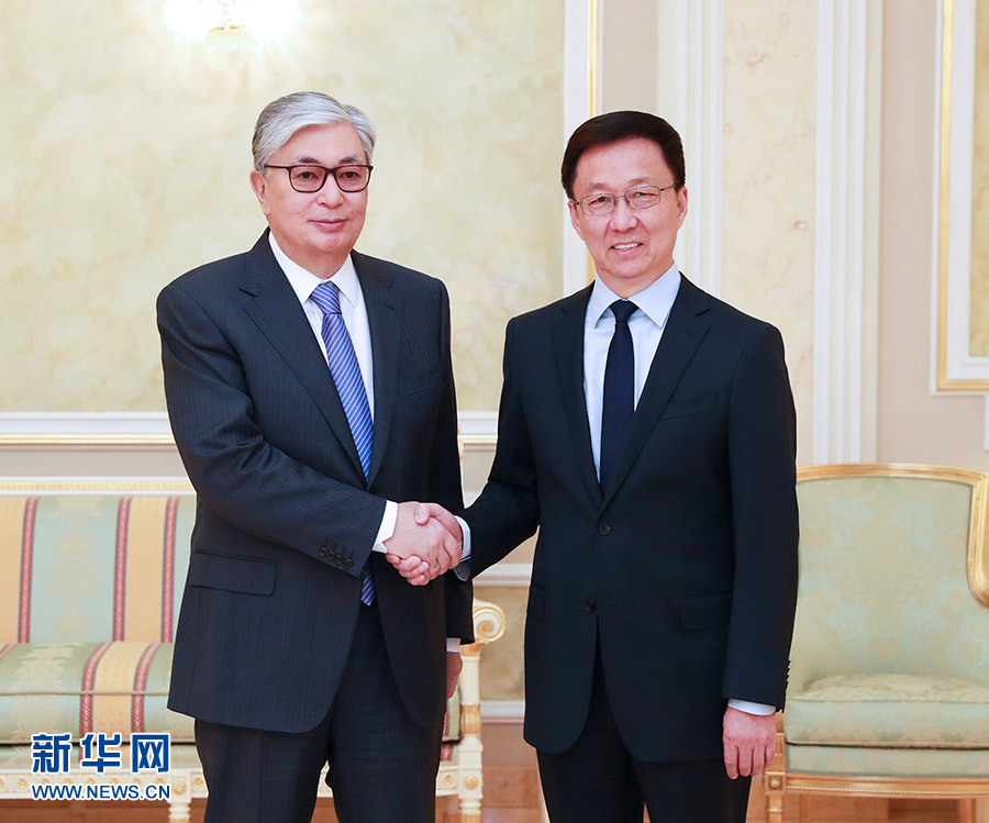5月16日,中共中央政治局常委、國務院副總理韓正在努爾蘇丹會見哈薩克斯坦總統(tǒng)托卡耶夫。 新華社記者 龐興雷 攝