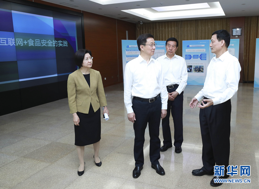 6月13日,在2019年全國食品安全宣傳周活動(dòng)前夕,中共中央政治局常委、國務(wù)院副總理、國務(wù)院食品安全委員會主任韓正到國務(wù)院食品安全委員會辦公室主持召開座談會,聽取對食品安全工作的意見建議。這是會前,韓正參觀食品安全工作情況展示,考察了解食品安全智慧監(jiān)管的創(chuàng)新舉措。 新華社記者 龐興雷 攝