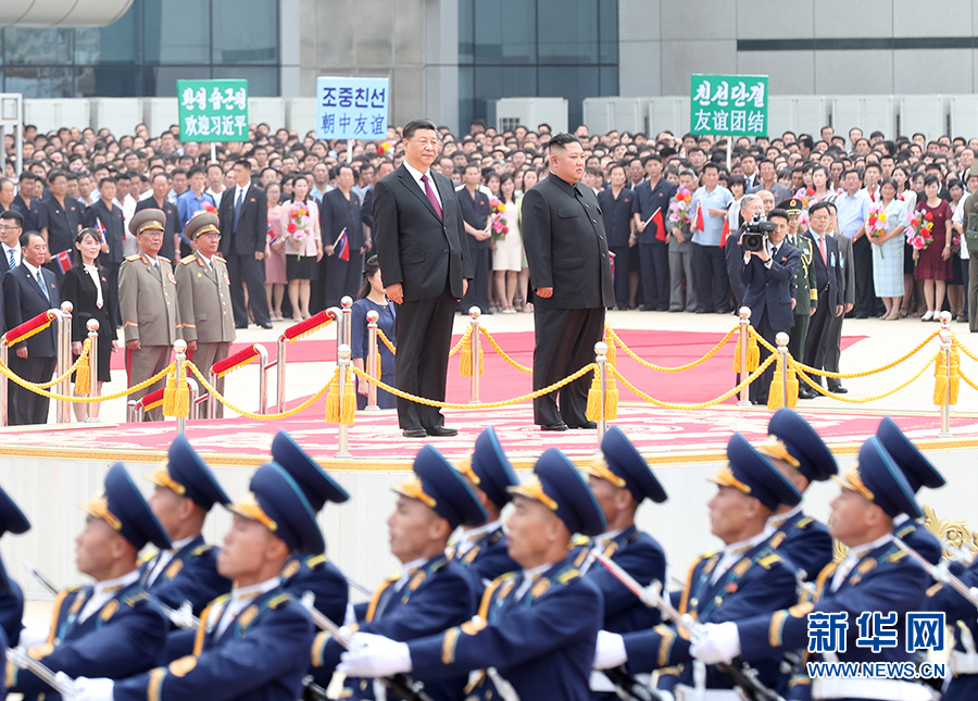 朝方在機(jī)場舉行隆重歡迎儀式。在21響禮炮聲中,軍樂隊奏中朝兩國國歌,習(xí)近平在金正恩陪同下檢閱了朝鮮人民軍三軍儀仗隊,并觀看了分列式表演。