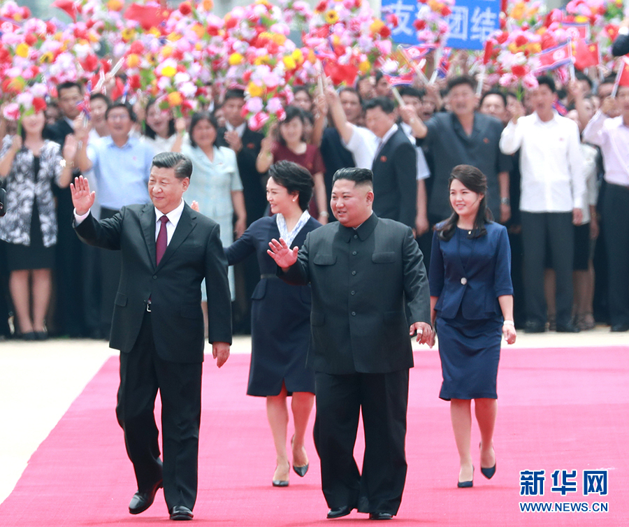 當(dāng)?shù)貢r間12時許,習(xí)近平乘坐的專機(jī)抵達(dá)平壤順安機(jī)場。雨后初晴的平壤,天高云淡、氣候怡人,到處郁郁蔥蔥、繁花似錦,整個城市洋溢著友好熱烈的氣氛。機(jī)場上中朝兩國國旗迎風(fēng)飄揚,“熱烈歡迎中國共產(chǎn)黨中央委員會總書記、中華人民共和國主席習(xí)近平同志”“鮮血凝成的朝中兩國人民之間牢不可破的友誼團(tuán)結(jié)萬歲”大幅標(biāo)語高高懸掛,近萬名群眾排列成整齊的隊伍,有力地?fù)]動著花束,以歡快的口號和熱情的笑容,歡迎尊貴的中國客人到來。朝鮮勞動黨委員長、國務(wù)委員會委員長金正恩和夫人李雪主到機(jī)場迎接。