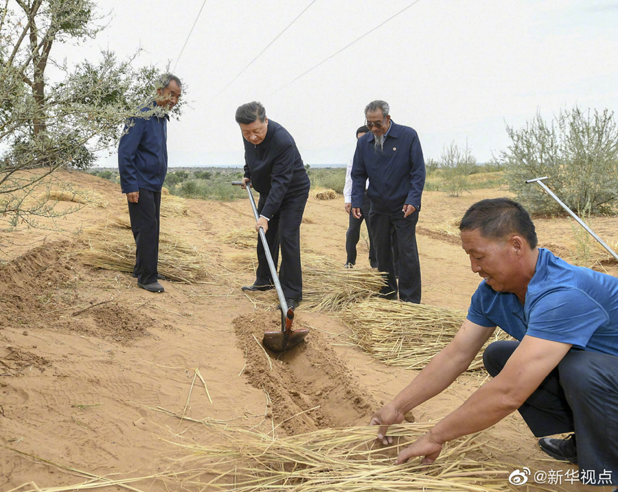 正在甘肅考察的習(xí)近平總書記,21日來到古浪縣八步沙林場,察看林場風(fēng)貌,聽取武威市防沙治沙情況匯報和八步沙林場“六老漢”三代人治沙造林的感人事跡介紹,還拿起一把開溝犁,參與到治沙勞動中。習(xí)近平強(qiáng)調(diào),我們要實(shí)現(xiàn)從富起來到強(qiáng)起來,就要把生態(tài)文明建設(shè)當(dāng)作大事來抓,建設(shè)美麗中國。當(dāng)前,生態(tài)文明觀念日益深入人心,要繼續(xù)發(fā)揚(yáng)“六老漢”的當(dāng)代愚公精神,再接再厲,再立新功,久久為功,讓綠色的長城堅不可摧。(文字記者:張曉松、朱基釵 攝影記者:鞠鵬、謝環(huán)馳)?