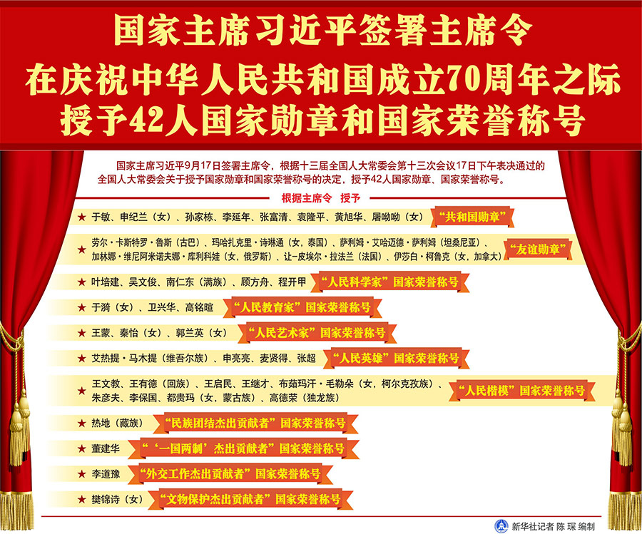 新華社北京9月17日電? 國家主席習(xí)近平17日簽署主席令,根據(jù)十三屆全國人大常委會第十三次會議17日下午表決通過的全國人大常委會關(guān)于授予國家勛章和國家榮譽(yù)稱號的決定,授予42人國家勛章、國家榮譽(yù)稱號。