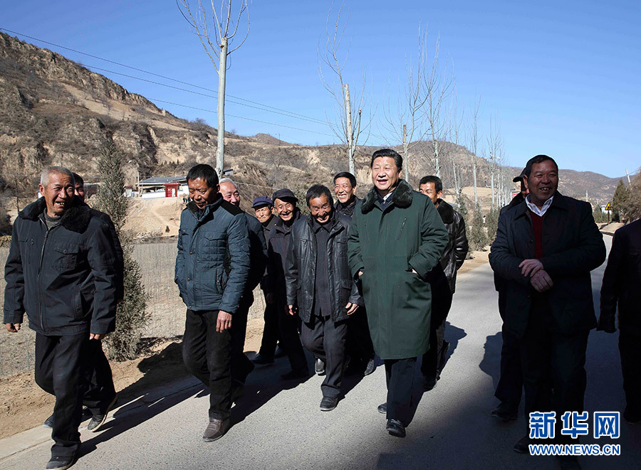 2015年2月13日,農(nóng)歷羊年春節(jié)來臨之際,習(xí)近平在陜西延安市延川縣文安驛鎮(zhèn)梁家河村調(diào)研時(shí)同村民邊走邊聊。新華社記者 蘭紅光 攝