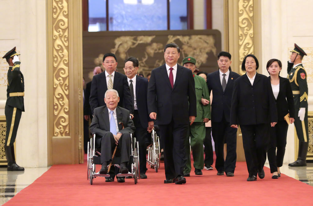 ?萬眾矚目之下,習(xí)近平總書記同他們一同步入會(huì)場。在雄壯激昂的《向祖國致敬》樂曲聲中,總書記為他們一一頒授勛章獎(jiǎng)?wù)?,親切握手、表示祝賀。