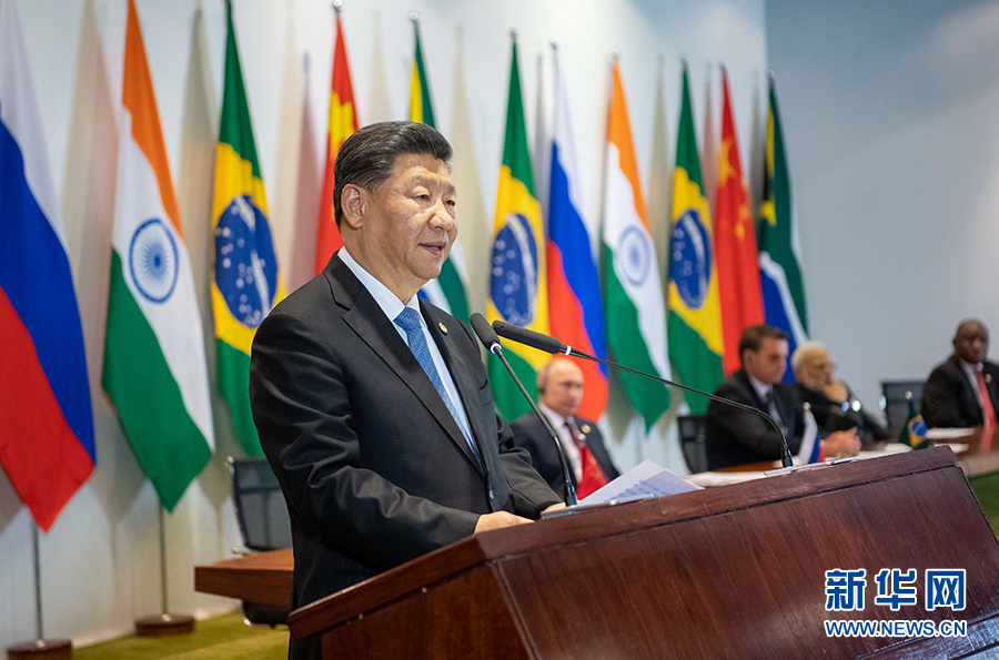 當(dāng)?shù)貢r(shí)間11月14日,金磚國家領(lǐng)導(dǎo)人同金磚國家工商理事會(huì)和新開發(fā)銀行對(duì)話會(huì)在巴西利亞舉行。中國國家主席習(xí)近平、巴西總統(tǒng)博索納羅、俄羅斯總統(tǒng)普京、印度總理莫迪、南非總統(tǒng)拉馬福薩共同出席。這是習(xí)近平發(fā)表講話。 新華社記者 李學(xué)仁 攝