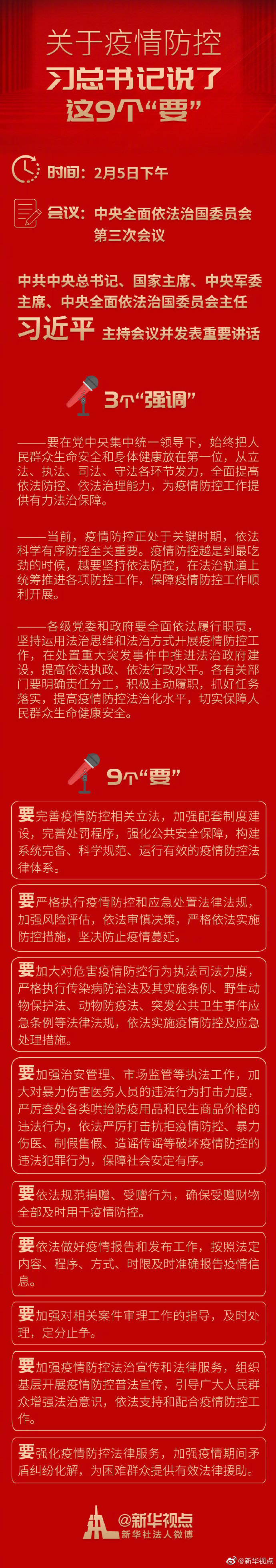 2月5日下午,中共中央總書記、國家主席、中央軍委主席、中央全面依法治國委員會主任習近平主持召開中央全面依法治國委員會第三次會議強調(diào),全面提高依法防控依法治理能力,為疫情防控提供有力法治保障。