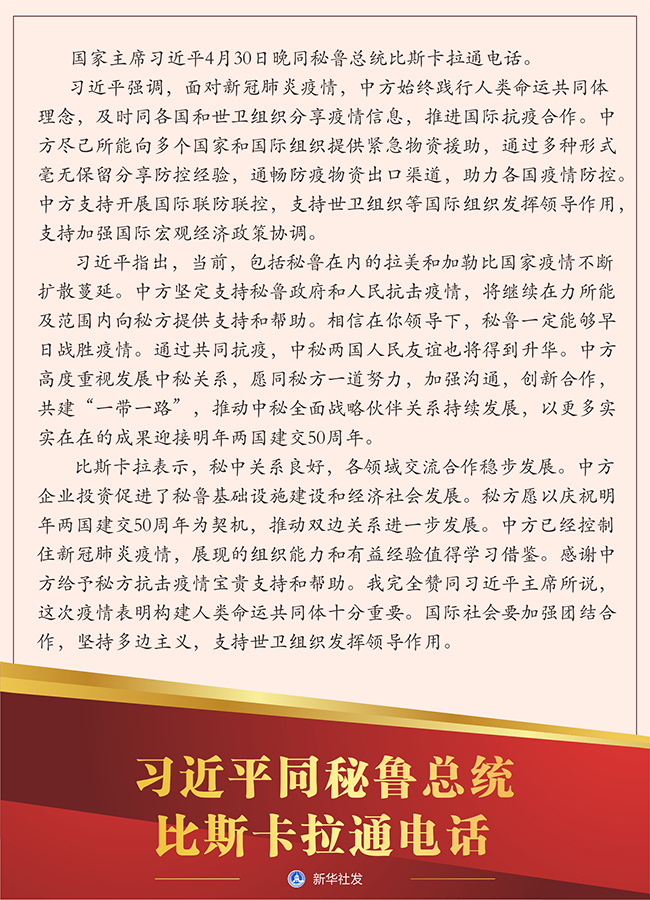 比斯卡拉表示,秘中關(guān)系良好,各領(lǐng)域交流合作穩(wěn)步發(fā)展。中方企業(yè)投資促進(jìn)了秘魯基礎(chǔ)設(shè)施建設(shè)和經(jīng)濟(jì)社會發(fā)展。秘方愿以慶祝明年兩國建交50周年為契機(jī),推動雙邊關(guān)系進(jìn)一步發(fā)展。中方已經(jīng)控制住新冠肺炎疫情,展現(xiàn)的組織能力和有益經(jīng)驗(yàn)值得學(xué)習(xí)借鑒。感謝中方給予秘方抗擊疫情寶貴支持和幫助。我完全贊同習(xí)近平主席所說,這次疫情表明構(gòu)建人類命運(yùn)共同體十分重要。國際社會要加強(qiáng)團(tuán)結(jié)合作,堅(jiān)持多邊主義,支持世衛(wèi)組織發(fā)揮領(lǐng)導(dǎo)作用。