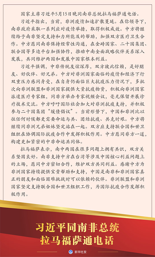習近平指出,當前,非洲疫情加速擴散蔓延。在你領導下,南非政府采取一系列應對疫情舉措,取得積極成效。中方將繼續(xù)給予南非堅定支持和力所能及的幫助,加強雙方醫(yī)療衛(wèi)生合作。中方愿同南非保持經(jīng)常性溝通,在金磚國家、二十國集團、聯(lián)合國等多邊平臺加強協(xié)作,推動中南全面戰(zhàn)略伙伴關系深入發(fā)展,共同維護兩國和發(fā)展中國家根本利益。