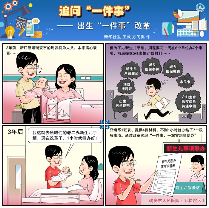 從6個(gè)部門(mén)的5張表格、24份材料,到群眾生活中的“一件事、一站零跑順便辦”,2019年7月,瑞安出生“一件事”改革經(jīng)驗(yàn)開(kāi)始在浙江全省推廣。