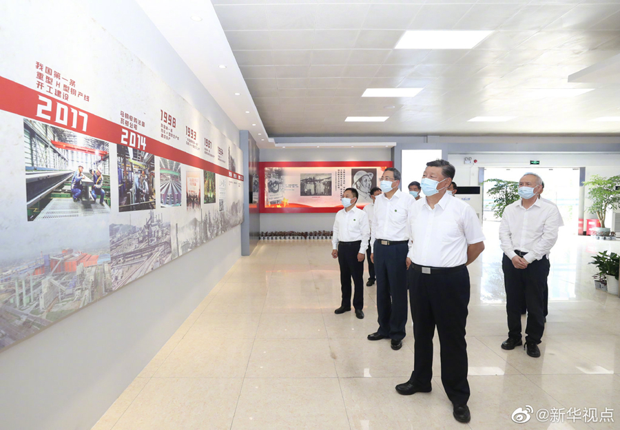 19日上午,正在安徽考察調(diào)研的習(xí)近平總書(shū)記走進(jìn)中國(guó)寶武馬鋼集團(tuán)優(yōu)質(zhì)合金棒材車間,冒著高溫察看生產(chǎn)運(yùn)行情況,并同勞動(dòng)模范、工人代表親切交流。習(xí)近平指出,在抗擊新冠肺炎疫情過(guò)程中,馬鋼較早復(fù)工復(fù)產(chǎn),實(shí)現(xiàn)了產(chǎn)量、營(yíng)銷收入同比雙升,展現(xiàn)了國(guó)有經(jīng)濟(jì)的強(qiáng)大韌性。他勉勵(lì)馬鋼在長(zhǎng)三角一體化發(fā)展中把握機(jī)遇、順勢(shì)而上,特別是要把自身改革發(fā)展同長(zhǎng)三角一體化發(fā)展有機(jī)結(jié)合銜接,力爭(zhēng)在長(zhǎng)三角一體化發(fā)展中不斷發(fā)展壯大自己,也為長(zhǎng)三角一體化發(fā)展作出自己的貢獻(xiàn)。(文字記者:張曉松 攝影記者:鞠鵬 王曄 燕雁)