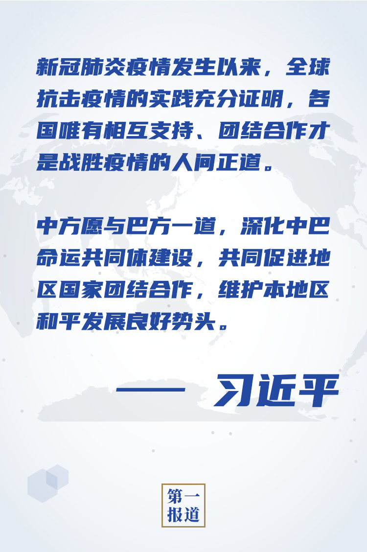 習(xí)近平強(qiáng)調(diào),新冠肺炎疫情發(fā)生以來,全球抗擊疫情的實(shí)踐充分證明,各國唯有相互支持、團(tuán)結(jié)合作才是戰(zhàn)勝疫情的人間正道。中方愿與巴方一道,深化中巴命運(yùn)共同體建設(shè),共同促進(jìn)地區(qū)國家團(tuán)結(jié)合作,維護(hù)本地區(qū)和平發(fā)展良好勢頭。