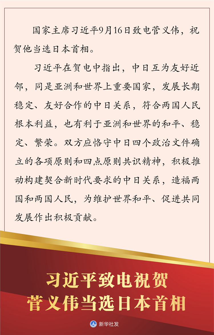 新華社北京9月16日電 國家主席習(xí)近平今天致電菅義偉,祝賀他當選日本首相。