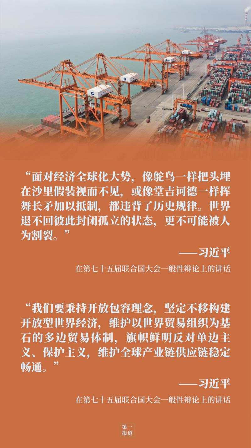 在聯(lián)合國(guó)“云講臺(tái)”,習(xí)主席還向國(guó)際社會(huì)生動(dòng)闡釋了中國(guó)“新發(fā)展格局”與構(gòu)建開放型世界經(jīng)濟(jì)、推動(dòng)全球經(jīng)濟(jì)復(fù)蘇的關(guān)系:“我們不追求一枝獨(dú)秀,不搞你輸我贏,也不會(huì)關(guān)起門來封閉運(yùn)行,將逐步形成以國(guó)內(nèi)大循環(huán)為主體、國(guó)內(nèi)國(guó)際雙循環(huán)相互促進(jìn)的新發(fā)展格局,為中國(guó)經(jīng)濟(jì)發(fā)展開辟空間,為世界經(jīng)濟(jì)復(fù)蘇和增長(zhǎng)增添動(dòng)力?!?/p>