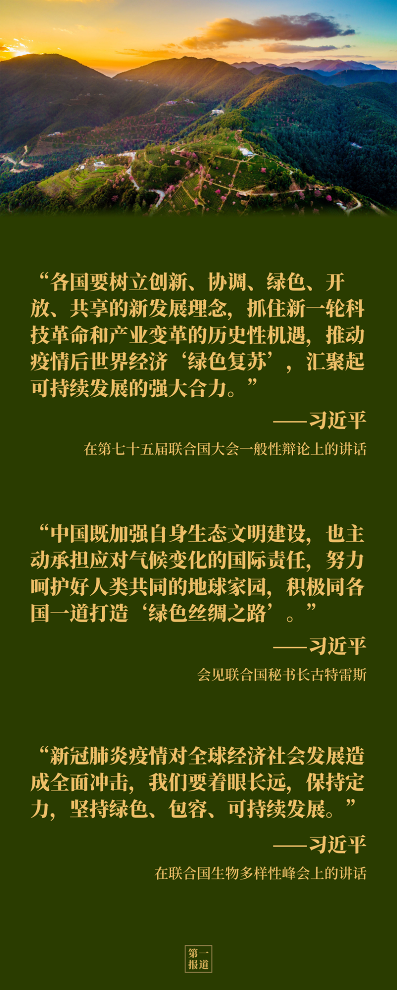 “創(chuàng)新、協(xié)調(diào)、綠色、開放、共享的新發(fā)展理念”“綠色復(fù)蘇”“綠色絲綢之路”……梳理習(xí)主席出席聯(lián)合國(guó)成立75周年系列高級(jí)別會(huì)議期間一系列重要論述,“綠色”是出現(xiàn)頻率最高的關(guān)鍵詞之一。