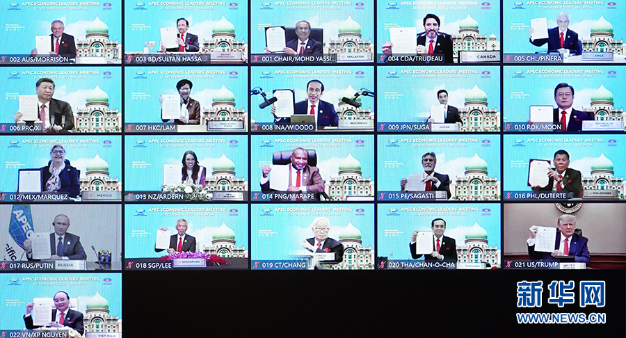 11月20日晚,國家主席習近平在北京以視頻方式出席亞太經(jīng)合組織第二十七次領(lǐng)導人非正式會議并發(fā)表重要講話。這是與會各經(jīng)濟體領(lǐng)導人、代表通過《2040年亞太經(jīng)合組織布特拉加亞愿景》并線上合影。 新華社記者 李響 攝