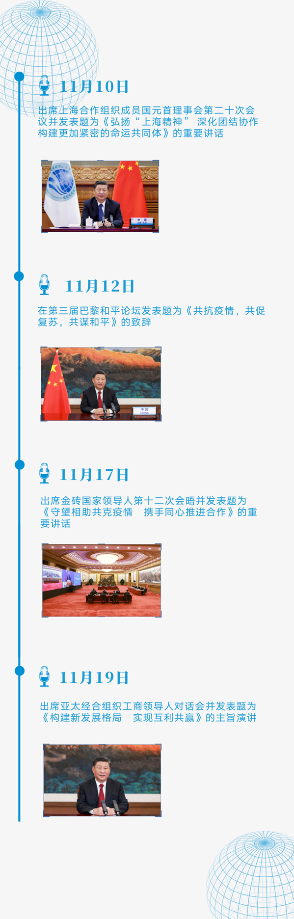 11月10日至22日,不到兩周時間,習(xí)主席以視頻方式出席4場多邊會議、一場國際論壇,發(fā)表8場重要講話、主旨演講和致辭,外交日程異常密集。